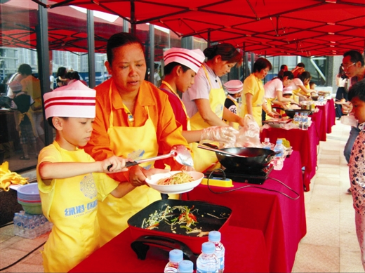 本報訊 昨日上午,南寧經(jīng)濟(jì)技術(shù)開發(fā)區(qū)在綠港·國際中心開展了以“關(guān)愛農(nóng)民工·綠港小廚神”親子活動,吸引了南寧經(jīng)開區(qū)園林綠化工人、水電維修物業(yè)工人、保潔人員等300多名進(jìn)城務(wù)工人員及其子女參加。在活動現(xiàn)場,參賽小選手們在父母的指導(dǎo)下井井有條地備菜、炒菜、起鍋,忙得不亦樂乎。