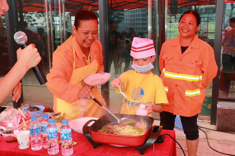 搶答活動(dòng)結(jié)束之后,進(jìn)入“小廚神”廚藝大比拼環(huán)節(jié)。由園林綠化工人、水電維修物業(yè)工人、保潔人員等進(jìn)城務(wù)工人員組成的5組家庭展開(kāi)了激烈的廚藝大比拼競(jìng)賽。看,小廚神們?cè)诟改傅闹笇?dǎo)下井井有條地備菜、炒菜、起鍋,忙得不亦樂(lè)乎。各色菜式色香味俱全,充分展現(xiàn)了孩子們“小當(dāng)家”的本領(lǐng)。半小時(shí)后,小廚神們?cè)诖蠹业臒崃艺坡曋型瓿闪吮荣惒似罚瑥N藝大師及現(xiàn)場(chǎng)觀眾根據(jù)完成的速度、菜品、味道等評(píng)出廚藝大賽一等獎(jiǎng)1名,二等獎(jiǎng)2名,三等獎(jiǎng)3名,優(yōu)秀獎(jiǎng)10名。