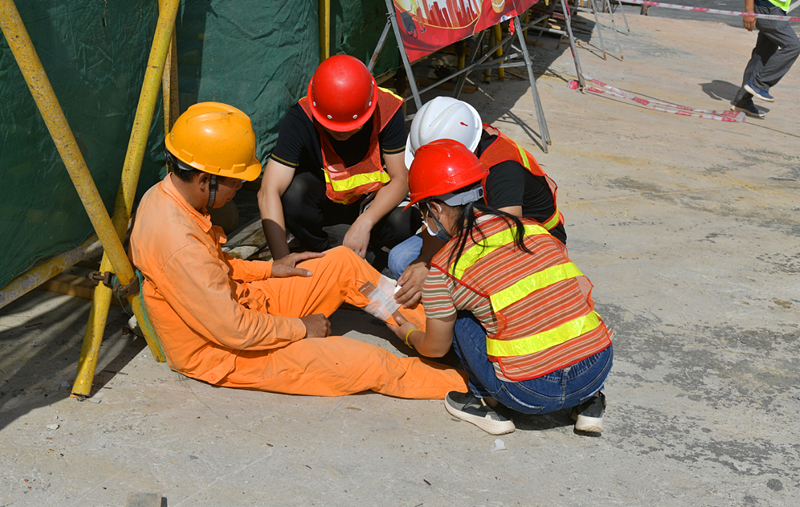 現(xiàn)場模擬一名工人在2#、3#廠房間的廊架上進行施工作業(yè)時,因未系安全帶、腳下未踩穩(wěn)造成高處墜落受傷,其他人員對其進行急救的情況。從發(fā)現(xiàn)人員墜落受傷、疏散人群、封鎖現(xiàn)場到對受傷人員骨折部位用夾板進行固定再送至醫(yī)院,僅歷時10分鐘。整個過程緊張有序,應(yīng)急處理得當。演練中,現(xiàn)場每名救援人員嚴肅認真對待每個演練細節(jié)。各應(yīng)急小組聞聲而動,各司其職,反應(yīng)迅速,各環(huán)節(jié)無縫銜接,使救援任務(wù)得以順利完成。