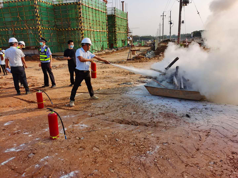 此次活動主要是模擬火災(zāi)發(fā)生后的應(yīng)急處置。活動當天,發(fā)現(xiàn)險情后,安全員立即上報,并進行控制和處理,并播報消防疏散通知。在總指揮的安排下,安全防護組、滅火行動組、疏散救援組、通訊聯(lián)絡(luò)組同時行動。安全防護組立刻關(guān)閉總電源閘門;滅火行動組拿取就近的消防器材進行滅火;疏散救援組迅速引領(lǐng)工人從安全通道撤離到安全地點;通信聯(lián)絡(luò)組將現(xiàn)場情況及時反饋給總指揮和現(xiàn)場指揮。待火勢完全撲滅,所有人員到達預(yù)定安全地點,通訊聯(lián)絡(luò)組認真清點人數(shù),確認無任何人員傷亡及財產(chǎn)損失。演練結(jié)束后,項目部組織滅火器的實操練習(xí)。施工人員按照講解的動作要領(lǐng)使用了滅火器,對布置的“起火點”進行有效撲救。