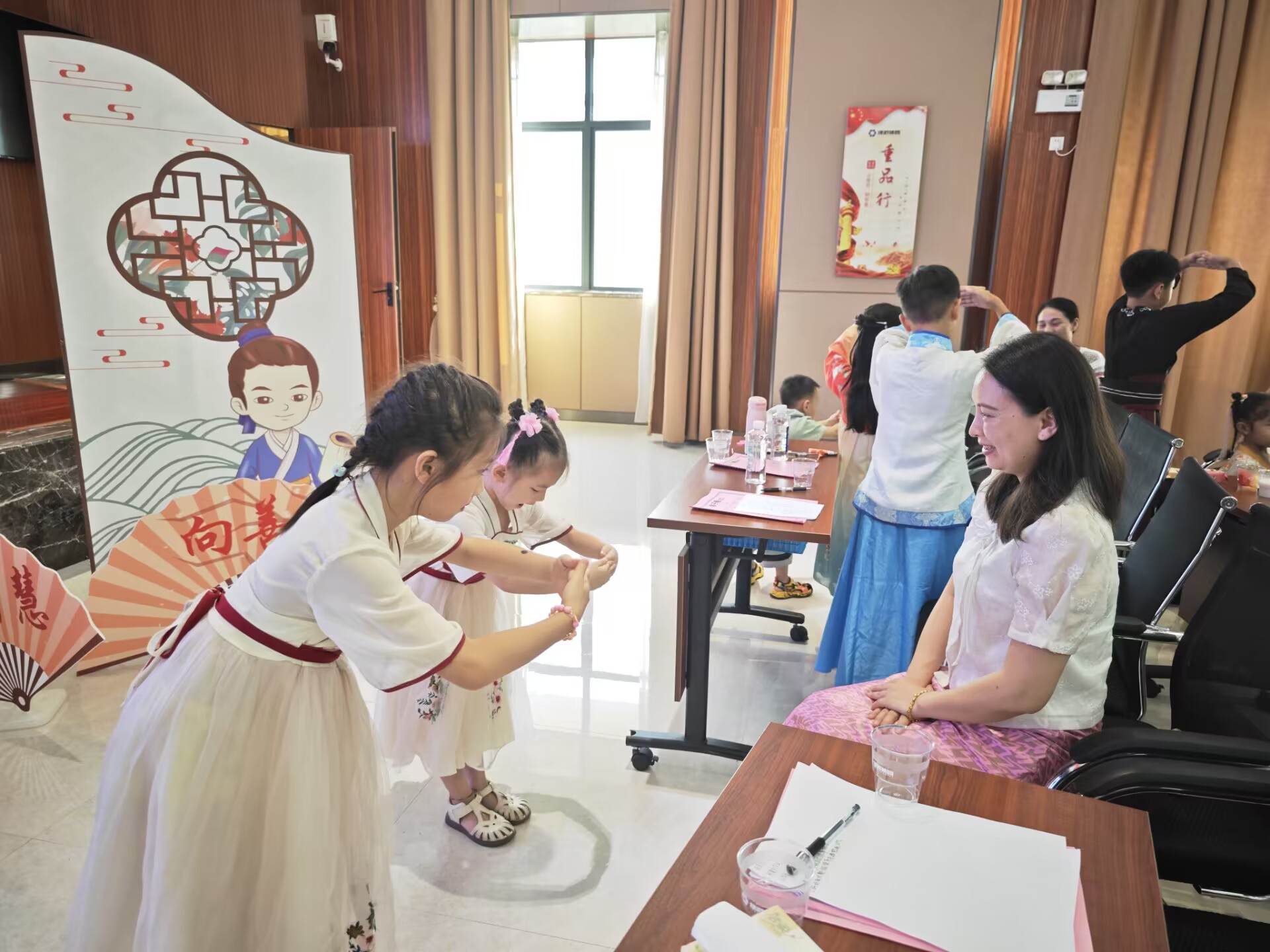 活動以傳統(tǒng)禮儀的學習和體驗為主題,此次培訓邀請了廣西經貿職業(yè)技術學院智慧商務產業(yè)學院的老師韋斯斯講授少兒禮儀知識。活動中,韋老師向孩子們講解了《弟子規(guī)》中學習的重要、做人的道理以及待人接物的禮貌常識,讓大家更好地理解傳統(tǒng)的禮儀。韋老師親身示范,教授大家如何正確行認知禮儀、家庭禮儀、餐桌禮儀、待客禮儀、交往禮儀、入泮禮、作揖禮、孝道禮儀等,在抬手躬身中感受禮儀之邦的古韻,學習尊師重教的品德。韋老師結合理論知識學習,邀請孩子們上臺實操演練,模擬情景表演、開展親子互動小游戲等,孩子們紛紛上臺,為大家展示,將學到的文明禮儀知識落實到行動中,培訓現場生動形象、氣氛熱烈,孩子們全神貫注聽取老師的講解,依照老師的示范,認真的學習禮儀,體驗傳統(tǒng)禮儀。