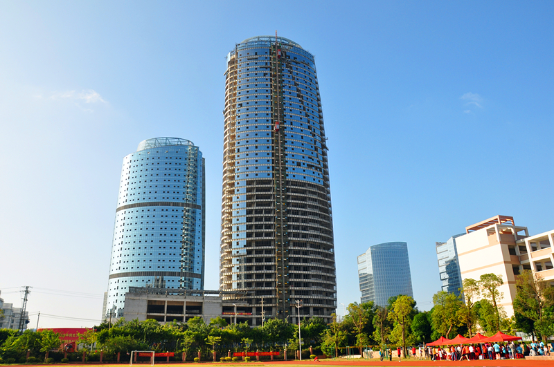 《建設(shè)中的綠港國際中心》(榮鑫公司 趙志業(yè))圖片說明:綠港國際中心正在做外墻玻璃裝飾施工,在陽光的照耀下美麗而雄偉。球場上的運動員意氣風發(fā)。預(yù)示著綠港集團充滿活力。