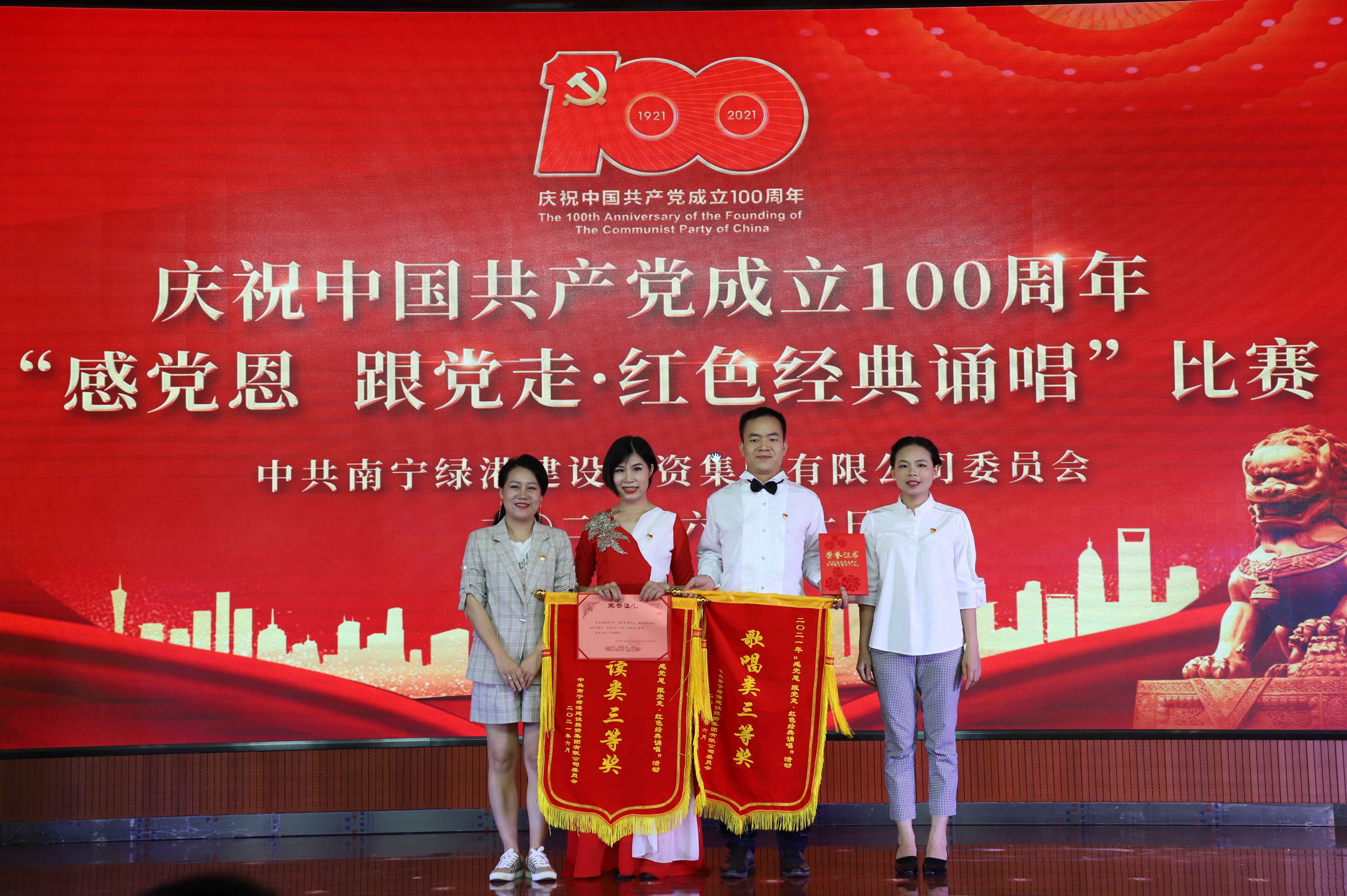 綠港集團(tuán)黨委書記、董事長(zhǎng)龔國(guó)強(qiáng)和黨委副書記、總經(jīng)理鄧?yán)^慧為獲得誦唱類二等獎(jiǎng)的機(jī)關(guān)一支部頒獎(jiǎng)