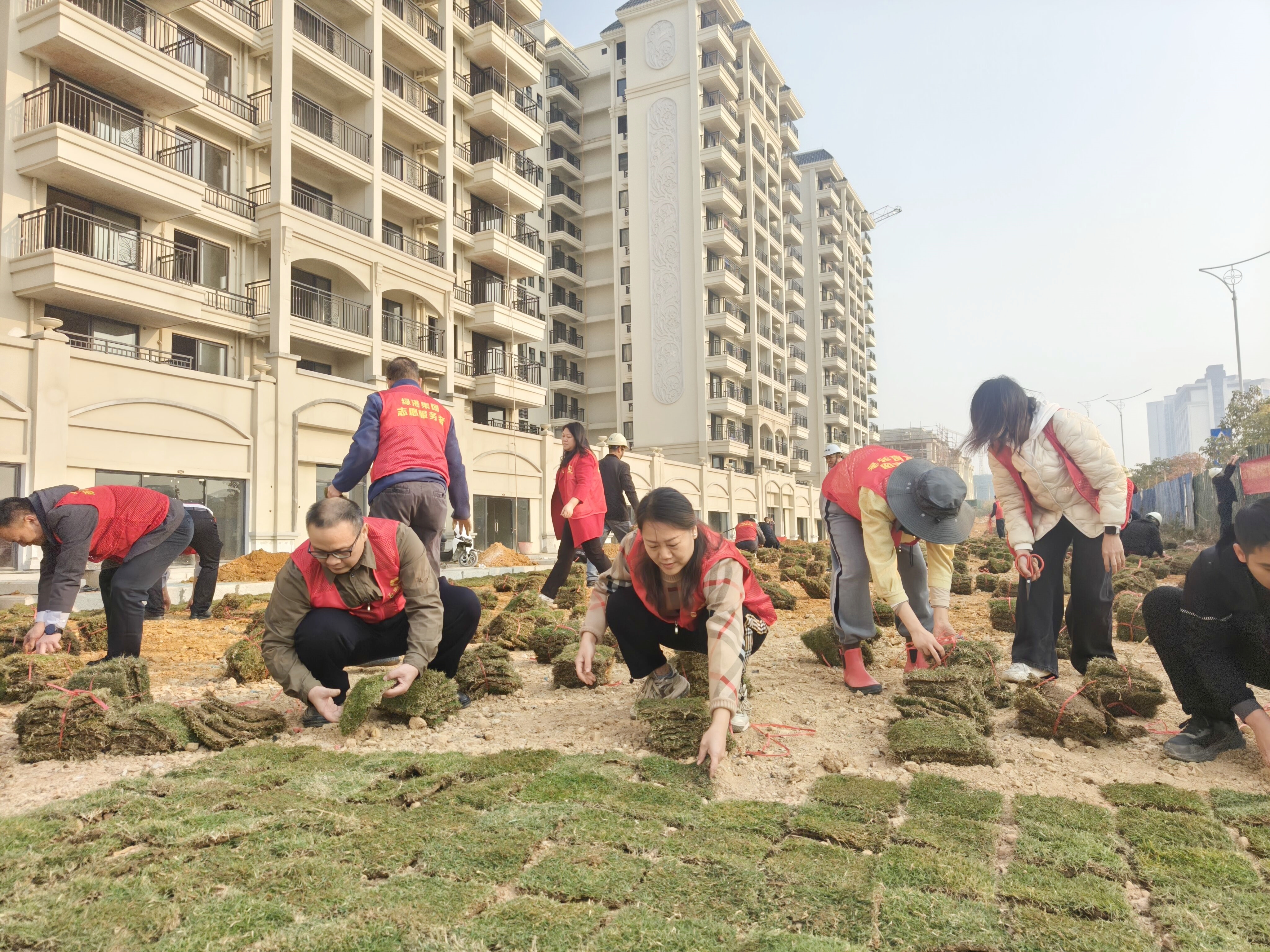 號角既已吹起,行動(dòng)便無止息?;顒?dòng)中,緊張有序的項(xiàng)目施工現(xiàn)場,呈現(xiàn)出一派熱火朝天的景象。嘉通公司黨支部、榮鑫公司黨支部的黨員及入黨積極分子們以身作則,與施工人員并肩作戰(zhàn),身著志愿者服裝,精神抖擻地投入到草坪鋪植工作中。大家各司其職、分工明確,齊心協(xié)力,有的負(fù)責(zé)搬運(yùn)草皮,有的進(jìn)行地面平整,有的仔細(xì)鋪設(shè)草皮,有的負(fù)責(zé)澆水養(yǎng)護(hù),每一個(gè)環(huán)節(jié)都嚴(yán)謹(jǐn)認(rèn)真、有條不紊,確保施工工程質(zhì)量和效果經(jīng)得起檢驗(yàn)。經(jīng)過全員共同努力,短短3個(gè)小時(shí),共完成了鋪植草皮50000塊,草坪面積共計(jì)2000㎡,呈現(xiàn)一派生機(jī)盎然,切實(shí)以實(shí)際行動(dòng)踐行初心使命,為項(xiàng)目“保交付”的順利推進(jìn)提供了堅(jiān)實(shí)保障。