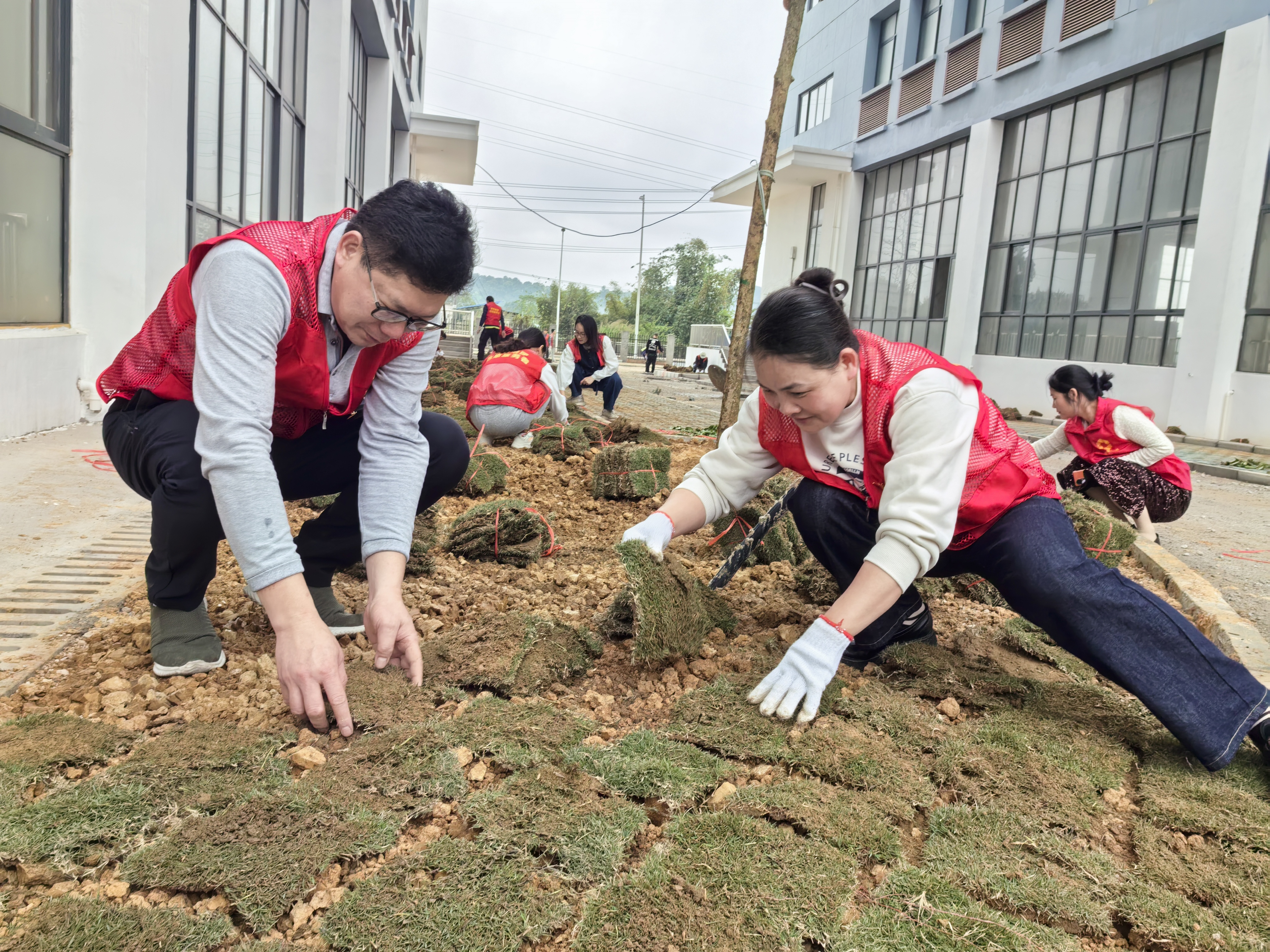 “這棵樹苗要扶正,不然長大后會歪的?!?/span>榮鑫公司黨支部委員、副總經(jīng)理唐欽月一邊指導(dǎo)身邊的同事,一邊用腳輕輕踩實樹苗周圍的泥土。她笑著說:“植樹就像培養(yǎng)孩子,一開始就要打下好基礎(chǔ)?!?/span>她的臉上掛著汗珠,但眼神中滿是認(rèn)真。不遠處,年輕的入黨積極分子楊文君正和同事們一起鋪設(shè)草皮。他們動作熟練,配合默契,不一會兒就鋪出了一大片嫩綠的草地。楊文君擦了擦額頭的汗水,笑著說:“今天雖然累,但看到這片新綠,心里特別踏實。作為入黨積極分子,能和黨員們一起為生態(tài)環(huán)境出一份力,感覺特別有意義。”